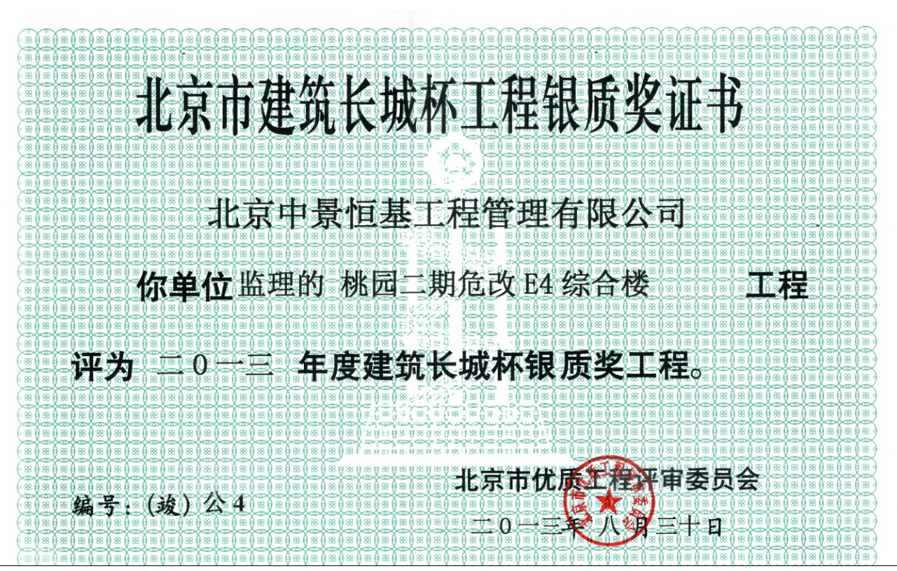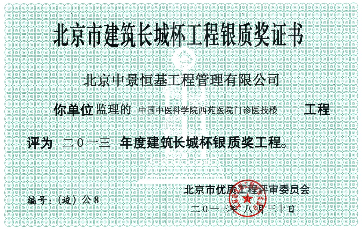 日前,根据北京市工程质量评选委员会评选,经北京住建委批准,2013年度我公司又荣获两个建筑(竣工)长城杯银质奖,分别是:“桃园二期危改E4综合楼”和“中国中医科学院西苑”,至此2013年度我公司共获得9个“长城杯”荣誉奖。
