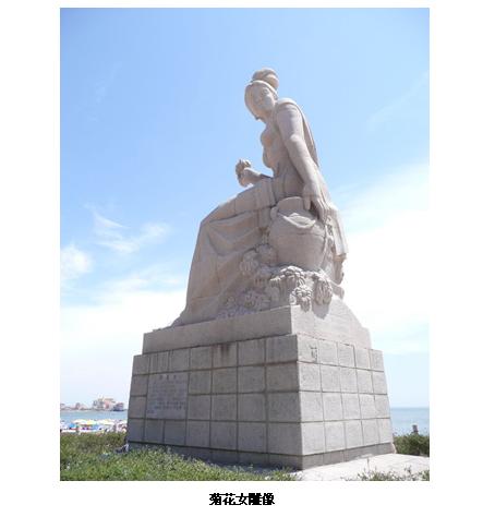 我们旅行的第一站是以美丽海景著称的菊花岛。兴城海滨浴场绵延十四公里,是我国北方最大的天然浴场。这里的海水深浅适宜,水面平稳,水波清澈见底;岸边沙滩细软晶莹;海岸上地势开阔,绿树掩映,是大海赐予人间的一片天然乐园。我们所在的兴海湾是兴城海滨最迷人的一段。步入滨海大道,放眼望去,是一座四柱三门二楼单檐庑殿门式正门,牌坊上是书画家范曾题写的“洪波涌起”和“古城在望”八个大字。越过此坊,便走进如诗如画的兴海湾:入口处一尊用花岗岩雕琢的高大的菊花女塑像正颔首相迎。菊花女是美丽、善良、勇敢、智慧和自我牺牲的精神化身,是兴城人民心目中的英雄。